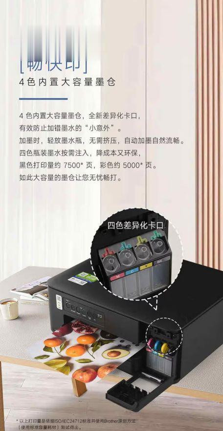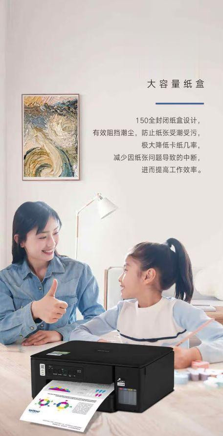 兄弟DCP-T435W在细节设计上也处处体现着对用户的关怀。150页封闭纸盒设计,有效阻挡潮尘,防止纸张受潮受污,降低了卡纸的几率,确保打印过程顺畅。四色差异化卡口设计,让用户告别加错墨的烦恼,45度灌墨方式也让补充墨水更加便捷。随机附赠的快速安装指南,让即使是初次使用打印机的用户也能迅速上手,享受无忧打印的乐趣。