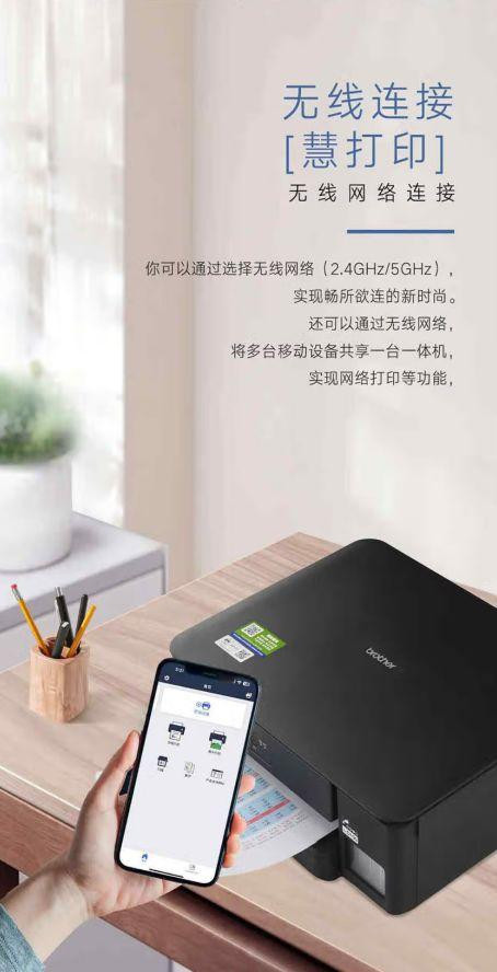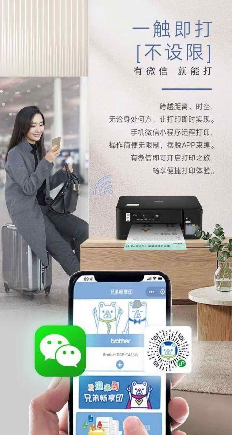 在智能设备普及的今天,兄弟DCP-T435W还提供了丰富的无线打印解决方案。它支持 2.4GHz/5GHz双频Wi-Fi,可轻松连接多台设备,实现家庭共享打印。微信小程序打印功能更是方便,用户无需安装额外 APP,就能通过手机直接发送打印任务,还能实现远程打印,即使不在家也能为孩子打印作业。此外,Brother Mobile Connect 和 AirPrint 技术的支持,让 iOS、Android 及 HarmonyOS 设备用户无需安装驱动程序,即可直接打印和扫描文件,进一步提升了使用的便捷性。